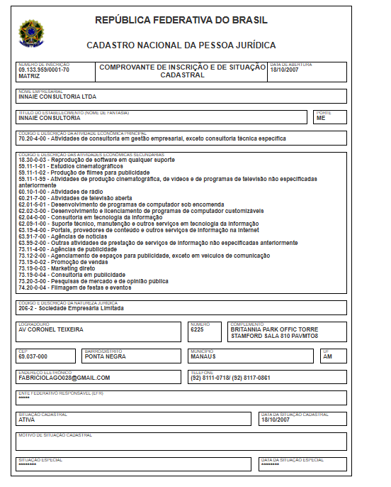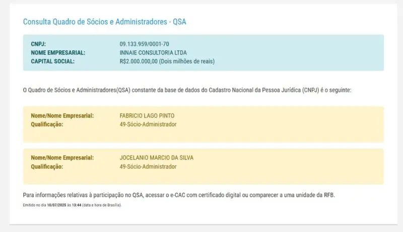 De acordo com informações da Receita Federal, a Innaie tem como sócios Jocelanio Mario da Silva e Fabrício Lago Pinto, nomes que já estiveram à frente da PS Publicidade, antiga razão social da própria Innaie.