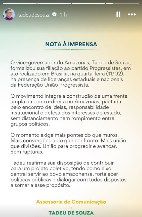 O vice-governador do Amazonas, Tadeu de Souza, confirmou nesta quinta-feira (12) a já esperada filiação ao Partido Progressista, levado para a Federação pelo governador Wilson Lima (UB), deixando o Avante de David Almeida e pavimentando o caminho para ser candidato a governador.