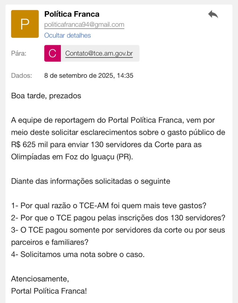 A equipe de reportagem do Portal Política Franca encaminhou para o Tribunal de Contas um e-mail questionando esses gastos.