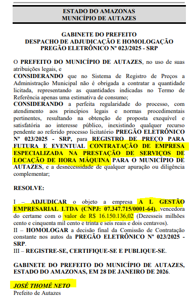 A Prefeitura de Autazes, no interior do Amazonas, firmou um contrato estimado em R$ 16.150.136,02 para serviços de locação de hora-máquina, por meio do Pregão Eletrônico nº 023/2025 – SRP, conforme despacho assinado pelo prefeito José Thomé Neto (PP).