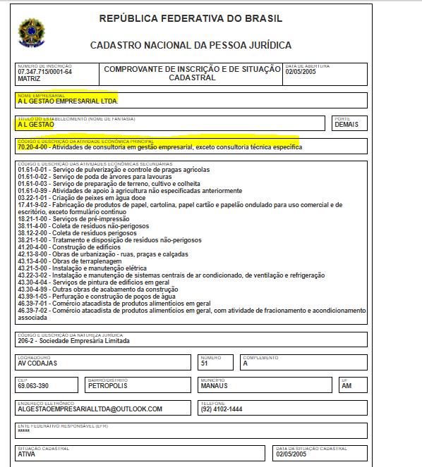 A empresa com a razão social A L Gestão Empresarial Ltda., tem o nome fantasia A L Gestão, opera com o CNPJ 07.347.715/0001-64 e foi fundada em 2005. O endereço de sua sede está localizada na Avenida Codajás, 51 – Petrópolis, Manaus. Sua atividade principal é de Atividades de consultoria em gestão empresarial, exceto consultoria técnica específica.