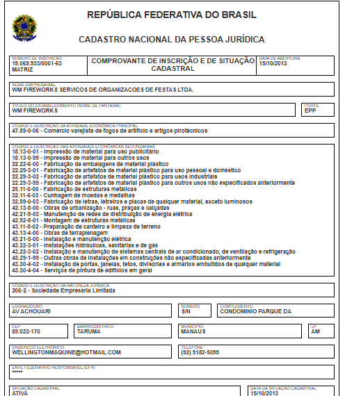 A empresa com a razão social Wm Fireworks Servicos de Organizacoes de Festas Ltda., tem o nome fantasia Wm Fireworks, opera com o CNPJ 19.069.933/0001-63 e foi fundada em 2013. O endereço de sua sede está localizada na Avenida Achouari – Taruma, Manaus. Sua atividade principal é de Comércio varejista de fogos de artifício e artigos pirotécnicos, segundo informações da Receita Federal.