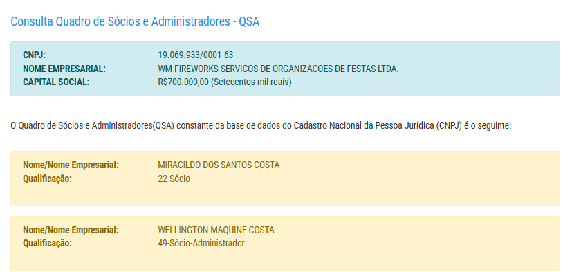 A empresa possui capital social de R$ 700 mil reais e pertence a Miracildo dos Santos Costas e Wellington Maquine Costa.