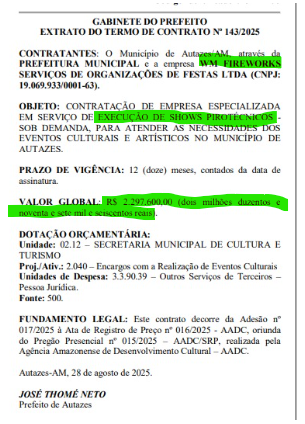 Sem nenhum evento cultural previsto, o prefeito de Autazes, Thomé Neto (PP), resolveu retirar dos cofres do município R$ 2.297.600,00 (Dois milhões, duzentos e noventa e sete mil e seiscentos reais). O valor global vai direto para os cofres da empresa WM Fireworks Serviços de Organizações e Festas LTDA.