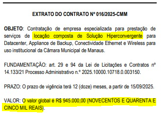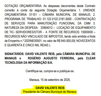 Que o vereador e presidente da Câmara Municipal de Manaus (CMM), David Reis (Avante), adora um gasto público não é novidade para ninguém. Desta vez, o vereador firmou um contrato de R$ 945 mil com a empresa Clear Tecnologia da Informação S/A, para fornecimento de apenas três aparelhos de infraestrutura hiperconvergentes.