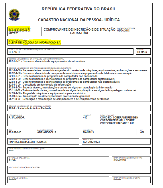 A empresa com a razão social Clear Tecnologia da Informação S.a., tem o nome fantasia Clear It, opera com o CNPJ 30.088.923/0001-08 e foi fundada em 03/04/2018. O endereço de sua sede está localizada na Rua Salvador, 440 – Adrianópolis, Manaus – AM, 69.057-040. Sua atividade principal é de Comércio atacadista de equipamentos de informática.