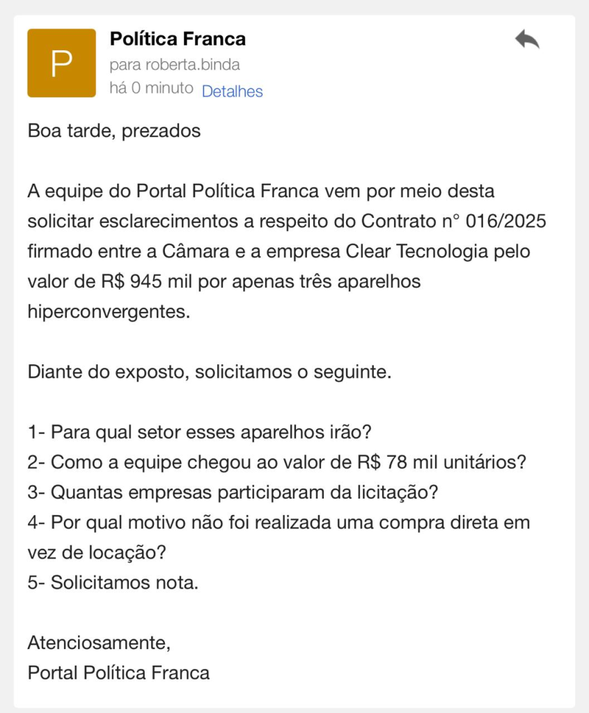 A equipe de reportagem do Política Franca encaminhou pedido de solicitação de nota sobre essa nova contratação realizada pelo vereador.