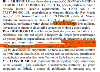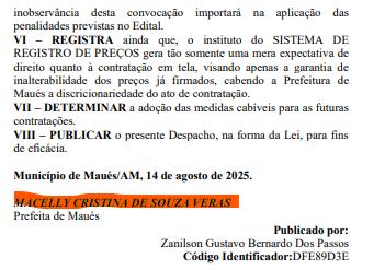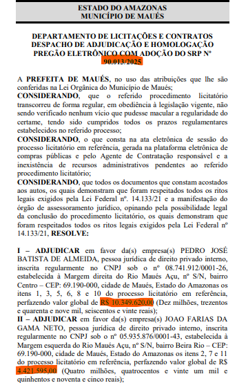 O documento com as informações, foi publicado no Diário Oficial dos Municípios (DOM) e assinado na última quinta-feira (14), pela própria prefeita. Segundo informações do documento, o Pregão Eletrônico n° 90.013/2025 foi firmado com três empresas de Maués.
