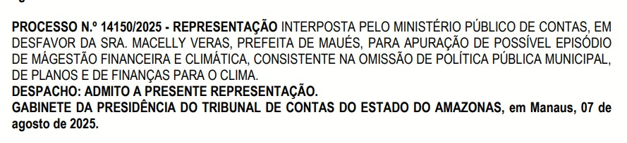 O despacho, foi assinado pelo gabinete da Presidência do TCE-AM, e determina a tramitação do processo para apuração dos fatos e eventuais responsabilidades. O caso segue em análise pela Corte de Contas, que poderá solicitar documentos, ouvir testemunhas e adotar outras medidas necessárias para elucidar a denúncia.
