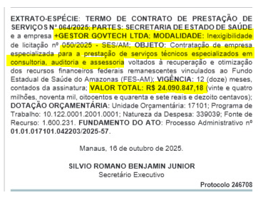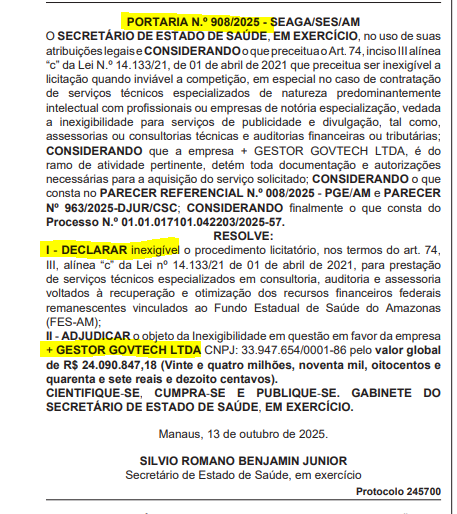 A dispensa de licitação foi definida no último dia 10 de outubro, por meio da Inexigibilidade de Licitação 050/25, assinada pelo secretário executivo da SES-AM, Silvio Romano Benjamin Junior. A falta de transparência se soma a um contexto de caos administrativo e suspeitas de corrupção dentro da Secretaria de Saúde.