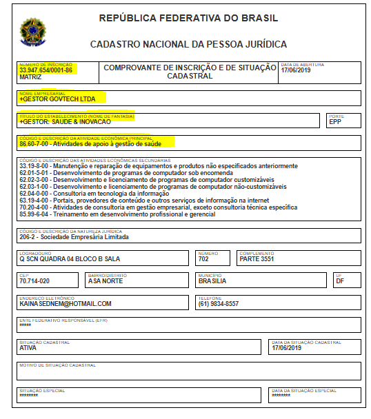 A empresa com a razão social +Gestor Govtech Ltda, tem o nome fantasia +Gestor: Saúde & Inovação, opera com o CNPJ 33.947.654/0001-86 e foi fundada em 2019. O endereço de sua sede está localizada na Quadra Scn Quadra 04 Bloco B Sala, 702 – Asa Norte, Brasília – DF. Sua atividade principal é de Atividades de apoio à gestão de saúde.