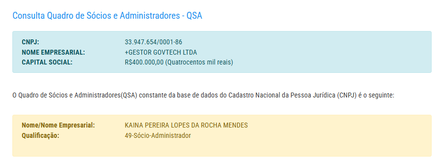 A empresa possui capital social de R$ 400 mil e pertence a Kaina Pereira Lopes da Rocha Mendes.
