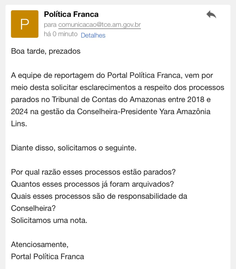 A equipe de reportagem do Portal Política Franca encaminhou para o Tribunal de Contas um e-mail questionando esses processos parados.